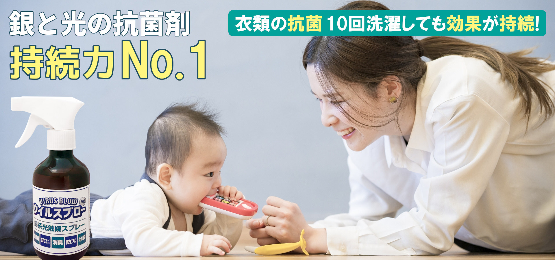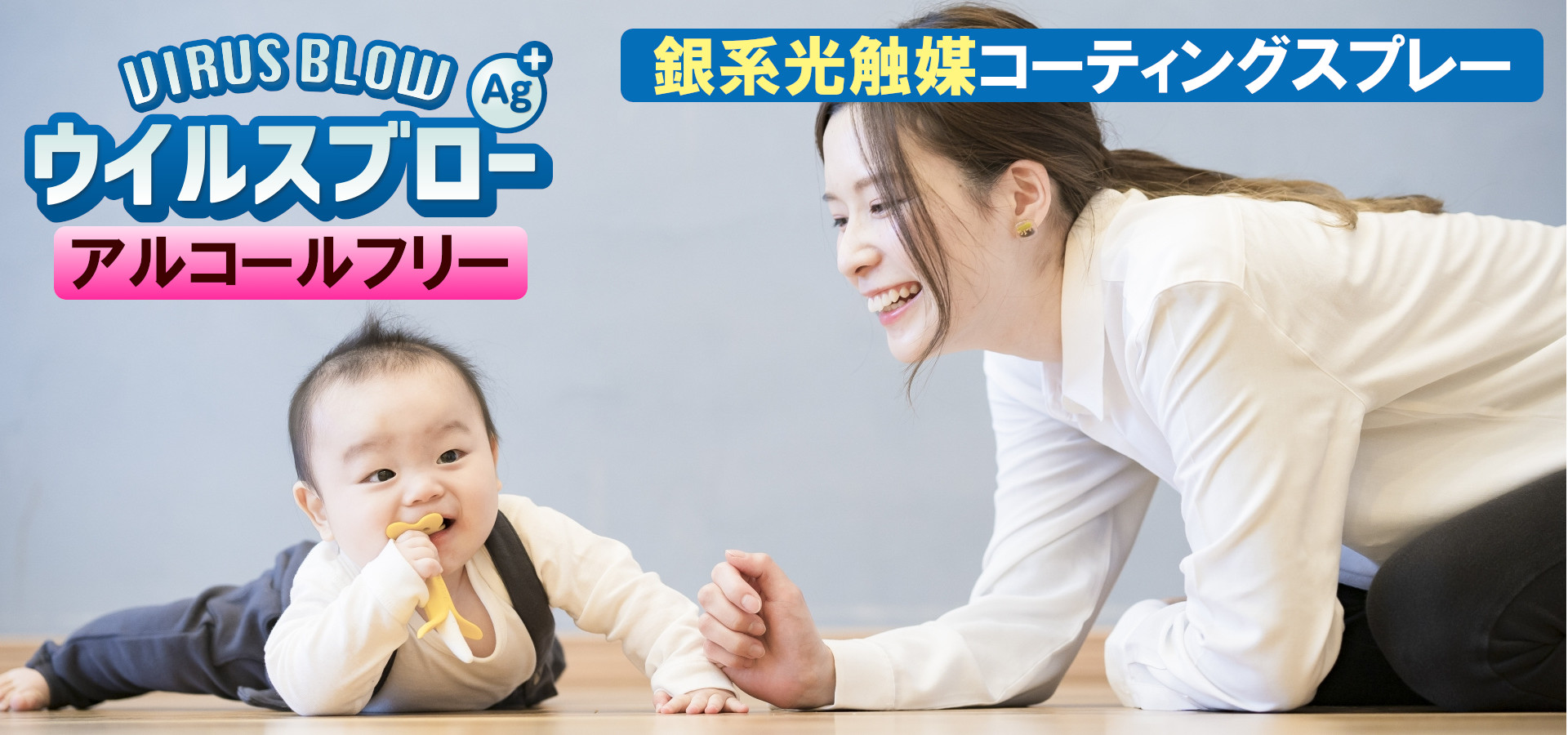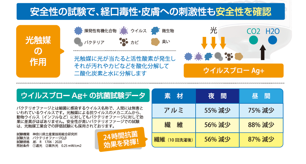 銀系光触媒の「ウイルスブローAg+」は、酸化チタンに銀イオンが配合。銀の力で、24時間消臭・抗菌作用を発揮。