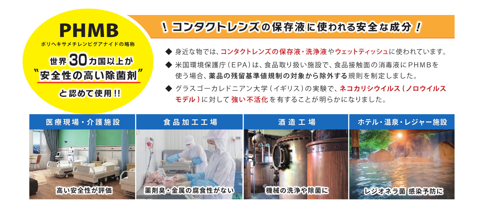 米国環境保護庁(EPA)は、PHMB(ポリヘキサメチレンビグアナイド)を食品取扱い施設における食品接触面の消毒液として使用する場合、 残留基準値規制の対象から除外する最終規則を官報で公表しており、アメリカでは安全性が高いとされています。 また、日本では、食品加工工場の洗浄、酒造工場、コンタクトレンズの保存液、ウエットティッシュなで採用されています。