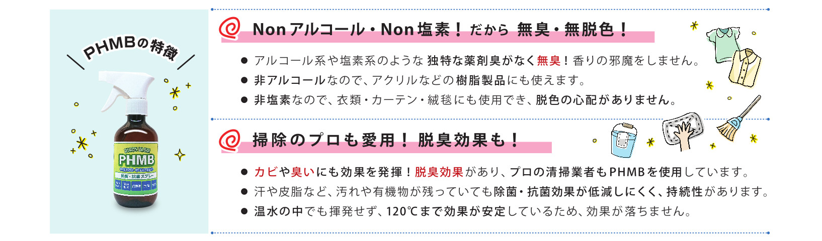 ●カビや臭いにも効果を発揮!脱臭効果があり、プロの清掃業者もPHMBを使用しています。